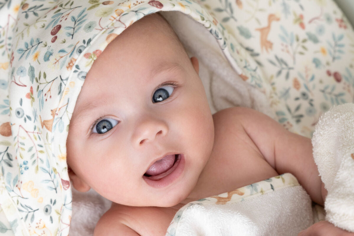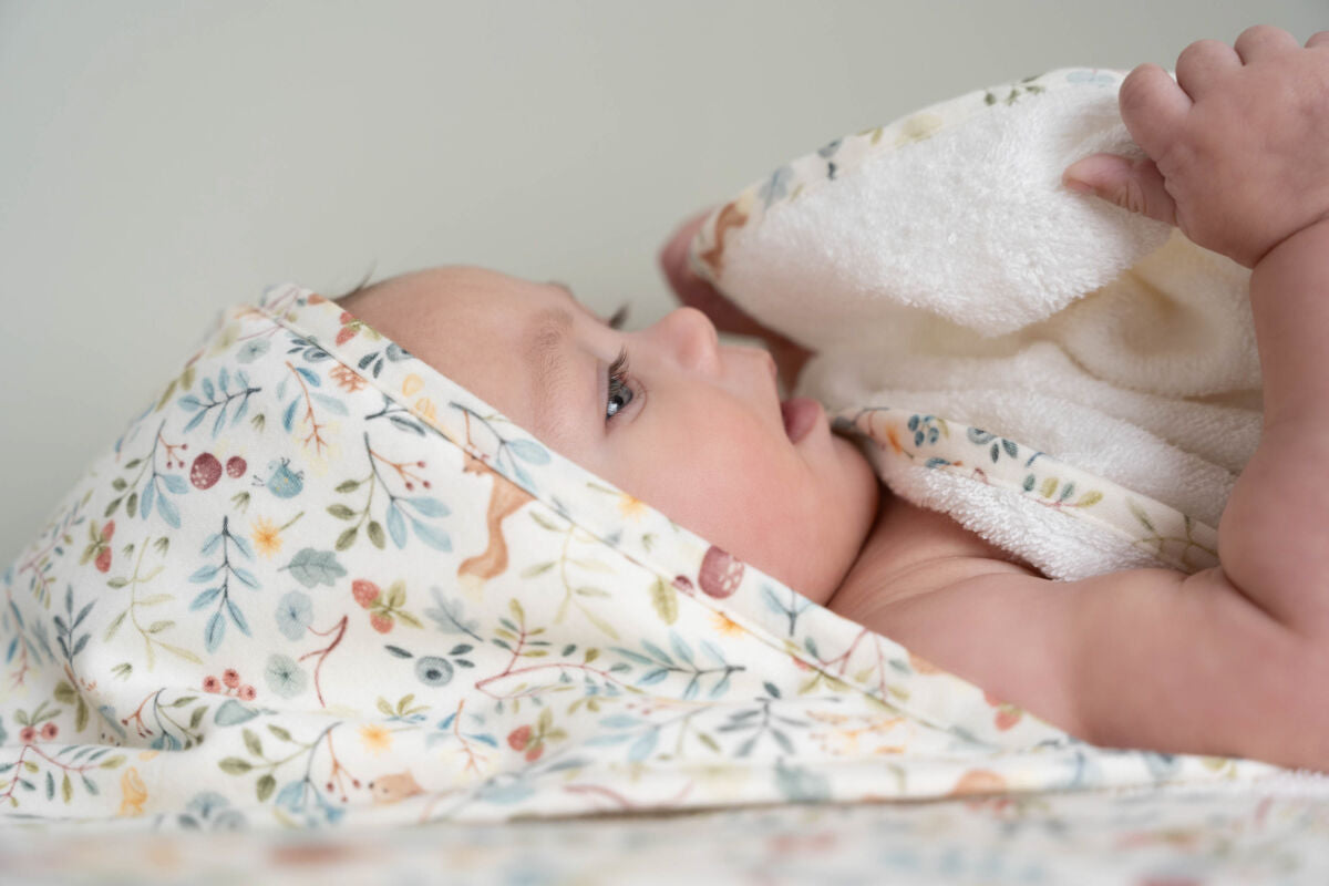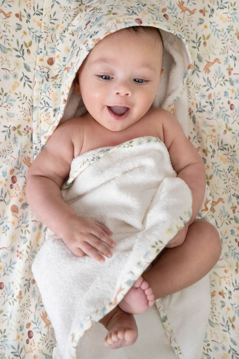 Apgaubkite savo mažylį šiluma ir jaukumu! Šis didesnio dydžio rankšluostis (100 × 100 cm) pagamintas iš 100% ekologiškos medvilnės frotinio audinio, kuris ypatingai švelniai priglunda prie jautrios odelės. Gobtuvas iš organinės trikotažinės medvilnės suteikia papildomos šilumos ir užtikrina, kad galvytė visuomet būtų tinkamoje temperatūroje, apsaugota nuo vėsaus vėjo. Baltojo rankšluosčio paprastumą pagyvina žaismingas „Forest Wonders“ dizainas – lyg mažytės pasakos akimirka vonios ritualuose.