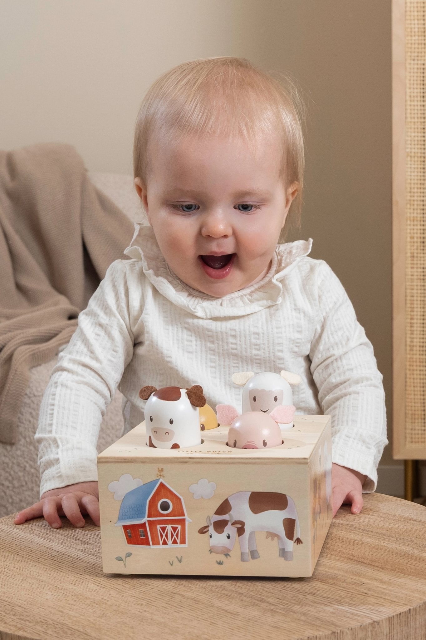 Kas ten šokinėja? Šis nuotaikingas medinis žaislas atgaivina ūkį su keturiais linksmais gyvūnais. Spustelėjus vieną – jis pasislepia, o kitas staiga išnyra! Karvė, avis, paršiukas ir viščiukas laukia, kol mažylis su jais žais ir kurs naujas istorijas.